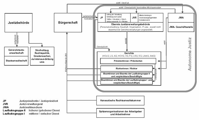 Im Mai 2009 veröffentlichte Justizsenator Dr. Till Steffen „Eckpunkte für ein Modell einer Autonomie der Hamburger Justiz“. Das Papier ist mit 22 Seiten zu lang, um es hier abzudrucken. Es kann im Internet heruntergeladen werden[1]. Nachstehend sei deshalb nur die graphische Darstellung der Eckpunkte seitens der Justizbehörde wiedergegeben.